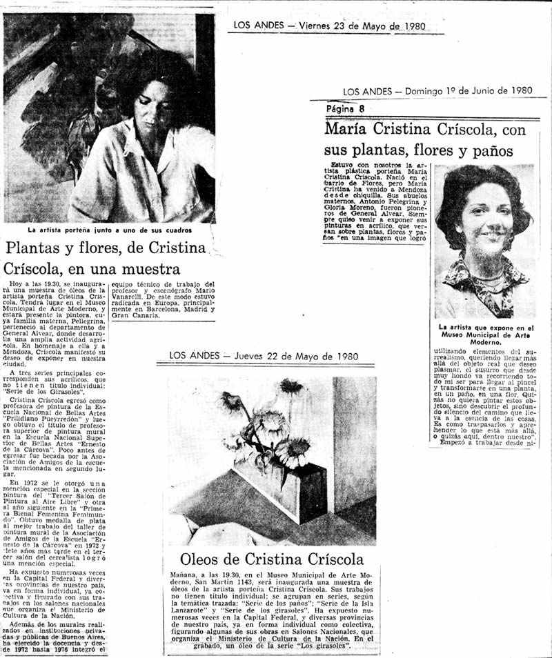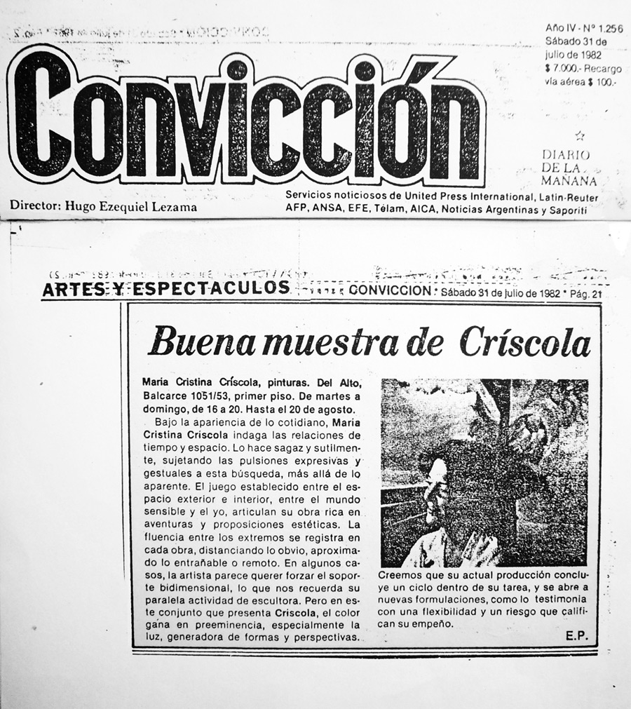 "La obra de María Cristina Criscola nos llama la atención porque el tema religioso no aparece como el desarrollo de una serie en función de ilustrar aspectos que hacen al culto, sino que ella parte del problema plástico para abarcarlo. Quizá lo novedoso sea la utilización de un lenguaje contemporáneo, con su consiguiente libertad en la realización".